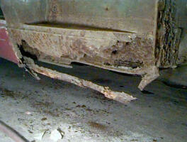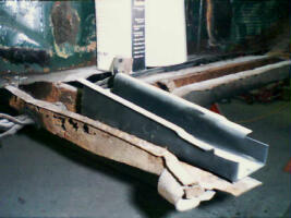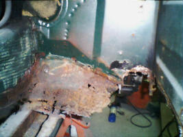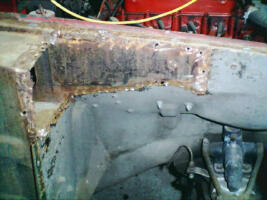 It doesn't get much more stripped than this! You can see one of the new "trumpet" sections held in place with a large clamp next to the engine bay, and the passenger side sill, rocker, and floor pan has been completely removed. On the bright side, the A