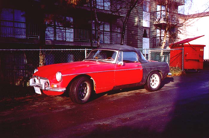 Took the car down to National Tire Warehouse for some new rubber.. after much research I decided on the Dunlop D60 A2 JLB's for their combination of price and performance. It's quite hard to find high performance tires in the correct size for the MGB's stock 14" rims. I calculated the original tire diameter of 155/78-14 to be 23.519" and so I got the Dunlops in 195/60-14 or 23.212" which is only 1.305% smaller than original. My new 14 inch "Dan Gurney Victory Mags" are 6" wide which is the mininum for these tires - I think they look quite aggressive without being ridiculous. Unfortunately on the "new" side (green quarterpanel), the tire is rubbing on hard cornering when the car is loaded, so that will have to be sorted out. Driving impressions: WOW!! The new tires are extremely sticky. Road noise is also down tremendously, and even the steering feels lighter even though these tires are wider. Since I got them mounted with a proper balance job, all traces of wheel shake are gone right up to ~ 90 mph. Combined with the new sills and freshly rebuilt suspension, the car feels like its on rails. I also took the chance to put on my spanking new K&N air filters. They were hard to locate, as they are Euro P/N 56-9095 and I had to order them from the UK. Moss used to carry them, but now they carry a different K&N setup. These particular models are large enough to fit the TWM induction horns *inside* of them - the other models are not. The combination of free-flow filters and horns, assuming you have a good manifold and free-flow exhaust setup on the other end, will give a boost of several horsepower. Even though my exhaust is stock, I could tell a difference immediately in throttle response. I had to enrichen the mixture on the carbs by 4 flats - the old foam filters must have been extremely restrictive. The car feels like its pulling stronger as well, and the gas mileage seems slightly better. The engine compartment is starting to look pretty trick, when its cleaner I'll take a photo. Some pics of the (now dirty) final result - dig the nice two tone paint scheme! It's going to get even more interesting when I put the new boot lid and bonnet on.. but the main thing is that the car is now ready (minus fitting the rollbar) for the autocross season starting in March!!
