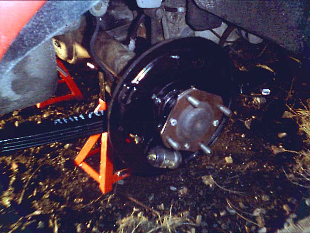 Let the games begin! Axle stands placed just ahead of the rear spring front mounting, and the trolley jack under the axle.
