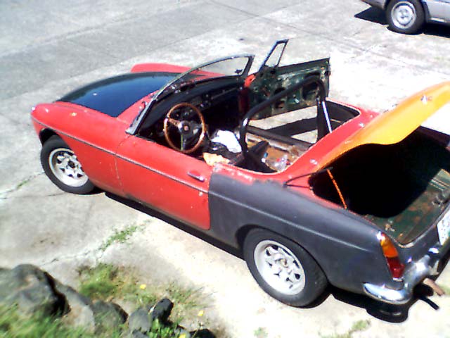 Doors stripped, windshield out, rollbar out, most interior out. Note the notches cut out of the battery cover for the rollbar mounting plates (me) and the crappy fiberglass transmission mods (DPO).